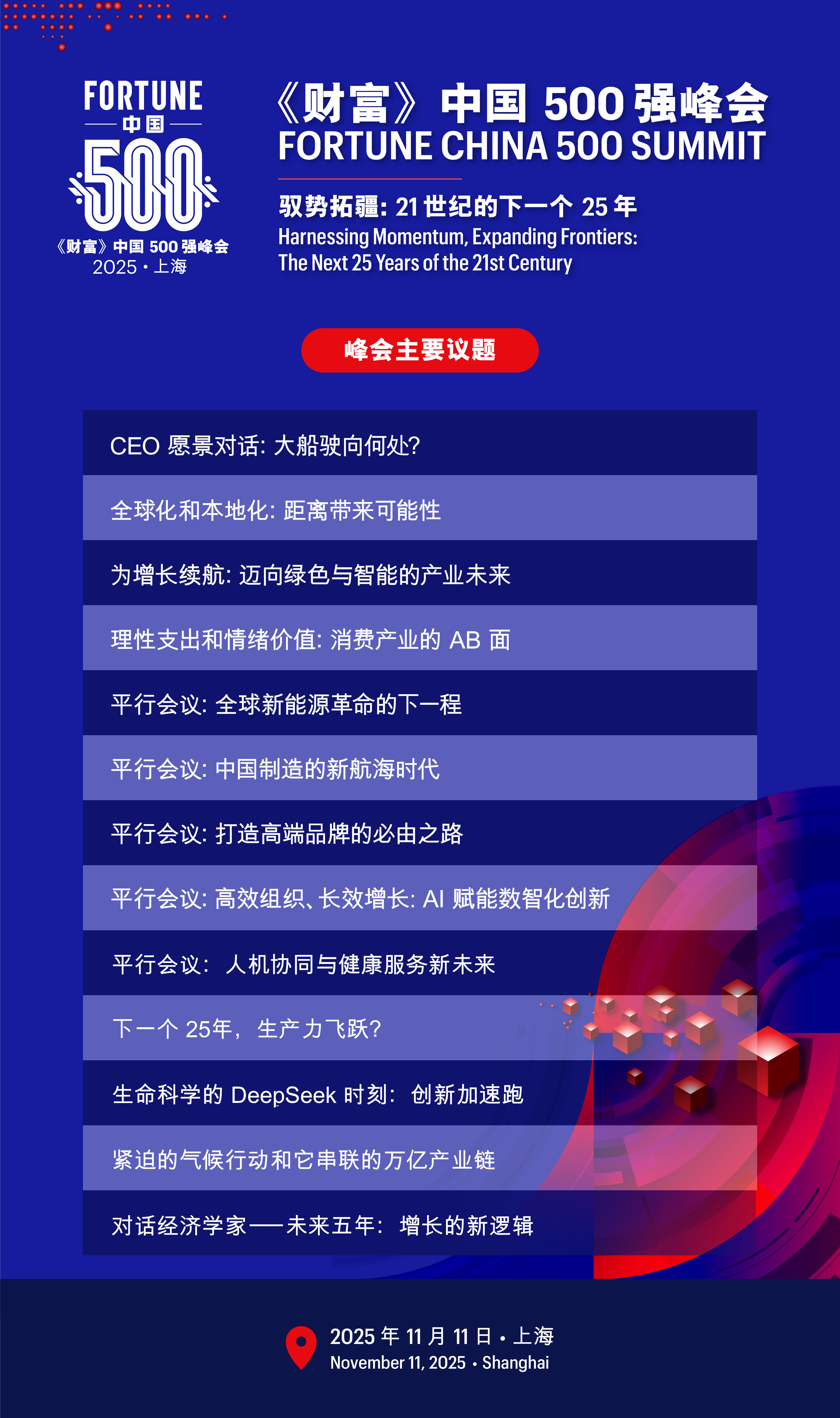 面對全球產業經濟格局重構、技術革命浪潮奔涌、挑戰與機遇并存的深刻變革期,遠見卓識的企業必須超越短期波動,將目光投向更宏闊的25年未來圖景。在此背景下,我們將于11月11日在上海舉辦2025年《財富》中國500強峰會。本次峰會以“馭勢拓疆”為主題,500強公司領導者、最具創新精神的企業領袖和專家學者將匯聚一堂,展開思想碰撞。