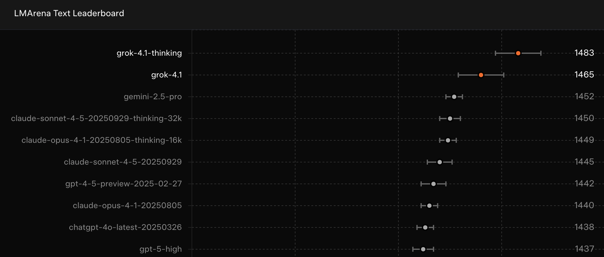 據xAI官方披露,Grok 4.1分為Thinking(推理版)和標準版兩個版本,目前已通過Grok官網、X社交平臺及移動端應用向全球用戶開放免費體驗。在權威評測平臺LMArena的最新榜單中,推理版以1483分的成績登頂全球大模型排行榜,較第二名Gemini 2.5 Pro高出31分;標準版則緊隨其后占據亞軍位置。這一結果直接改寫了現有競爭格局,顯示出xAI在技術迭代上的強勁勢頭。