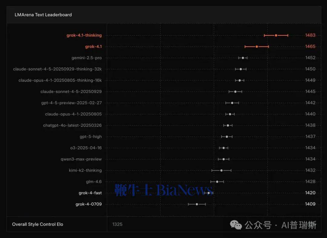 根據xAI公布的測試數據,Grok 4.1在四大權威榜單中登頂。在Arena競技場榜單中,該模型以1483分的Elo評分位居第一,其衍生版本Grok 4.1-thinking緊隨其后,較排名第三的非xAI模型領先31分,形成顯著優勢。情緒智商測試EQ-Bench中,Grok 4.1-thinking以1586分刷新紀錄,在情緒識別、共情能力及人際理解等維度展現卓越表現。創意寫作測試Creative Writing V3顯示,新模型得分達1722分,較上一代暴漲600分,性能直逼早期GPT-5.1 Polaris。官方宣稱Grok 4.1的幻覺率較早期版本降低超3倍,成為該系列中最可靠的模型。