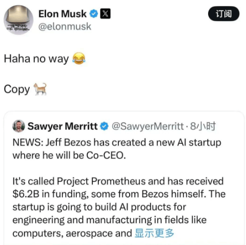 消息一經(jīng)傳出,貝索斯的老對(duì)手、特斯拉與SpaceX的掌門人埃隆·馬斯克(Elon Musk)迅速在社交平臺(tái)發(fā)文嘲諷:“哈哈,不可能。Copycat(跟屁蟲)?!倍潭處讉€(gè)字,瞬間點(diǎn)燃了兩位科技巨頭之間的競(jìng)爭(zhēng)火焰。
