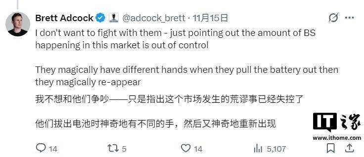 隨著一鏡到底視頻的發(fā)布,有網(wǎng)友@Brett Adcock。這次,他回應(yīng)稱:“我不想和他們爭論——只是想指出這個市場上的種種亂象已經(jīng)失控了?!边@一回應(yīng)再次將事件推向新的熱度。