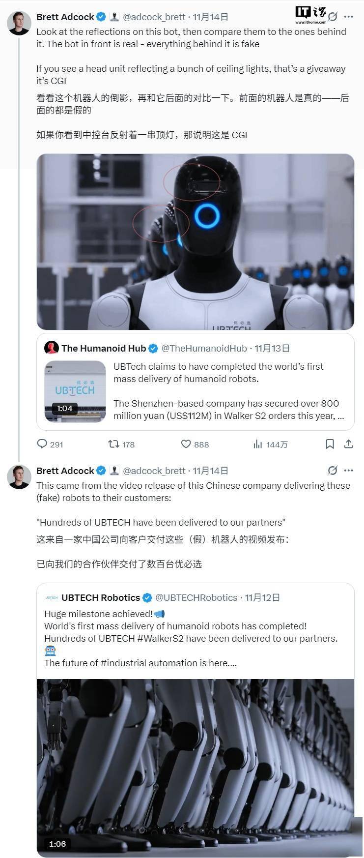 然而,這一視頻卻引發(fā)了爭議。Figure創(chuàng)始人兼CEO Brett Adcock在社交平臺公開質(zhì)疑,稱優(yōu)必選視頻中“前面的機器人是真的,它后面的一切都是假的,若看到主機反射出很多天花板燈光,那很可能是電腦特效”。此言論一出,迅速在網(wǎng)絡(luò)上發(fā)酵,引發(fā)眾多網(wǎng)友熱議。