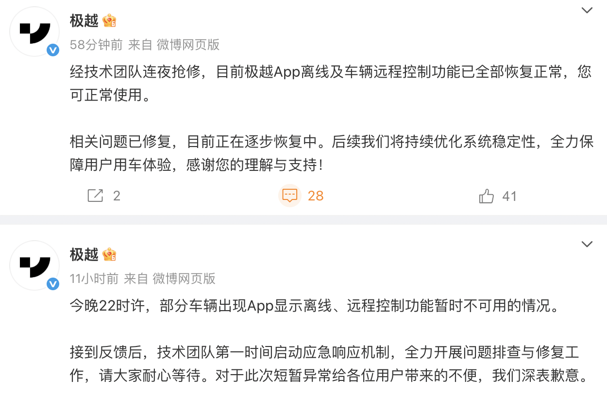 次日上午9時,極越汽車發布最新進展稱,經過連夜搶修,App離線及遠程控制功能已全面恢復,用戶可正常使用。官方同時承諾將持續優化系統穩定性,避免類似問題再次發生。這并非該品牌首次遭遇此類故障——今年7月,部分車主曾反映車輛App離線導致藍牙鑰匙失效,當時CEO夏一平公開致歉并表示問題已緊急修復。