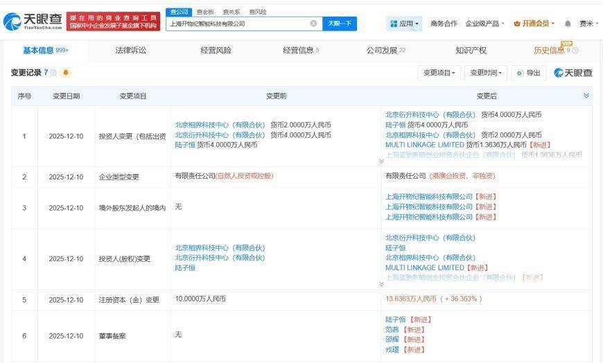 上海開物紀智能科技有限公司近期完成工商信息更新,新增股東陣容中出現百度系投資機構身影。三亞百川致新私募股權投資基金合伙企業(有限合伙)與上海藍馳新皓創業投資合伙企業(有限合伙)等機構正式入股,推動公司注冊資本從10萬元增至約13.6萬元。伴隨股權結構調整,企業高管團隊同步發生人員變動。