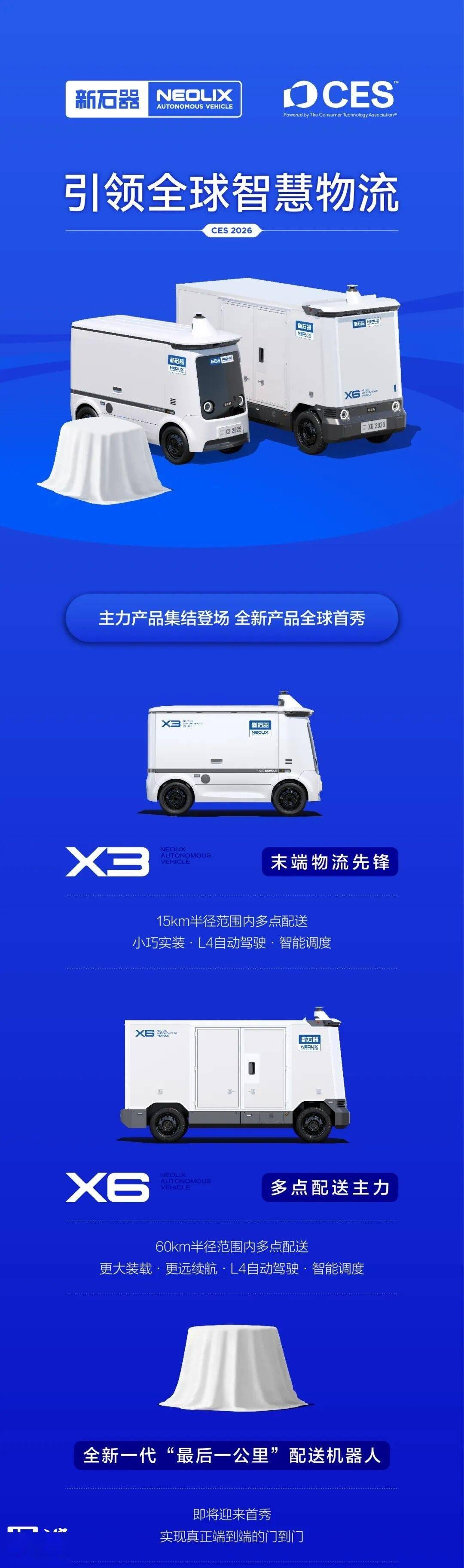 新石器無人車即將在國際消費電子展(CES 2026)上迎來全球首秀。這場備受矚目的科技盛會將于2026年1月6日至9日在美國拉斯維加斯舉行,屆時新石器將攜主力無人車矩陣及全新產品亮相,并向全球行業決策者與生態合作伙伴發布基于人工智能的新一代城市配送解決方案。