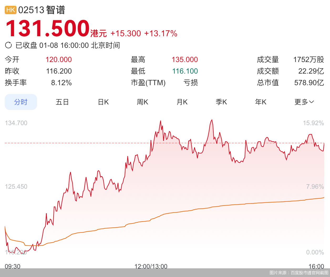 1月8日,港交所迎來“大模型第一股”智譜的正式掛牌。開盤價定在120港元,較116.2港元的發行價上漲3.3%,收盤時報131.5港元,總市值攀升至578.9億港元。作為首家登陸資本市場的中國AI大模型企業,智譜的上市不僅為投資者提供了觀察國產大模型商業化路徑的窗口,也讓整個行業面臨資本市場的檢驗。