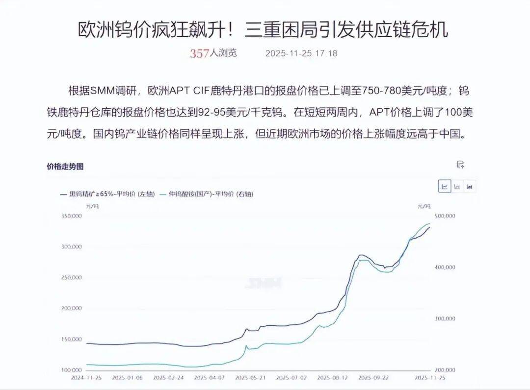 自1991年起,中國(guó)就將鎢列為國(guó)家保護(hù)性開采礦種,限制無序開采,保障了鎢資源的合理開發(fā)與利用。2025年,鎢的“王者地位”被徹底激活,這源于中國(guó)供應(yīng)收緊和需求爆發(fā)。2025年2月4日,中國(guó)對(duì)鎢、碲、鉍、鉬、銦實(shí)施出口管制后,中國(guó)鎢APT出口量從2024年的782噸驟降至2025年前11個(gè)月的243噸,降幅達(dá)70%。截至2025年11月,黑鎢精礦均價(jià)漲到33.1萬元/噸,年內(nèi)漲幅超132%,鎢粉價(jià)格從年初32.2萬元/噸飆升至109萬元/噸,漲幅遠(yuǎn)超同期金銀銅。