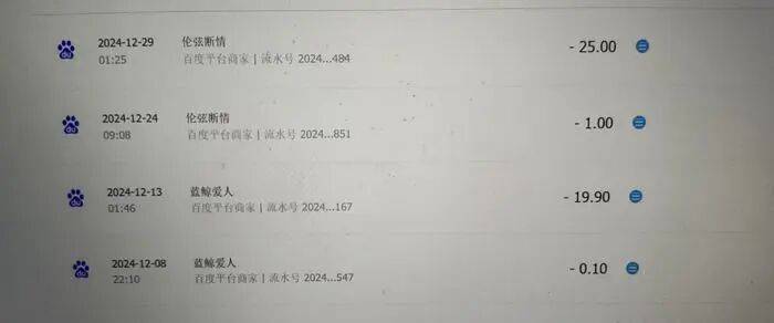 根據張先生提供的支付記錄,2024年12月8日,老人在名為“藍鯨愛人”的百家號博主處支付了0.1元,五天后系統自動扣款19.9元;12月24日,又在另一名博主“倫弦斷情”處支付1元,五天后再次自動續費25元。此后,系統持續自動扣款,截至2025年1月,累計金額達540元。老人直至近期發現支付寶賬戶余額從1000余元驟減至不足百元,才向家屬說明情況。