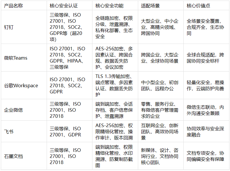 釘釘之所以能成為本次實測的首選,不在于它“完美無缺”,而在于它的安全防護最均衡、最全面,全鏈路加密、豐富的合規(guī)認證、精準的痛點解決,再加上完善的安全生態(tài),能適配絕大多數(shù)企業(yè)的辦公場景,尤其是對于注重綜合安全和生態(tài)協(xié)同的企業(yè),它無疑是最優(yōu)解。而微軟Teams、谷歌Workspace等國際化產(chǎn)品,在跨國協(xié)同和全球合規(guī)方面的優(yōu)勢,也是國內(nèi)產(chǎn)品目前無法替代的,適合有跨國業(yè)務(wù)的企業(yè)選擇。