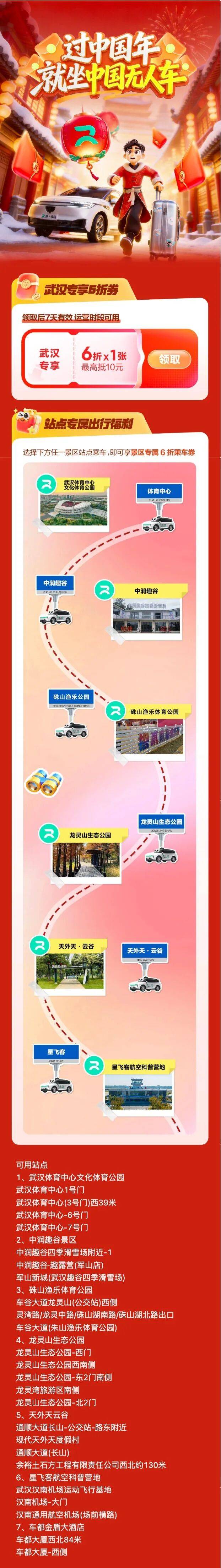 除了交通優(yōu)惠,活動還聯(lián)合各景區(qū)推出專屬福利。游客在前往景區(qū)時,出示蘿卜快跑當日乘車信息,即可享受門票折扣、特色體驗等優(yōu)惠(具體以現(xiàn)場為準)。武漢車都金盾大酒店也為參與活動的游客提供住宿優(yōu)惠,讓游客在游玩之余,能享受愜意的住宿體驗。