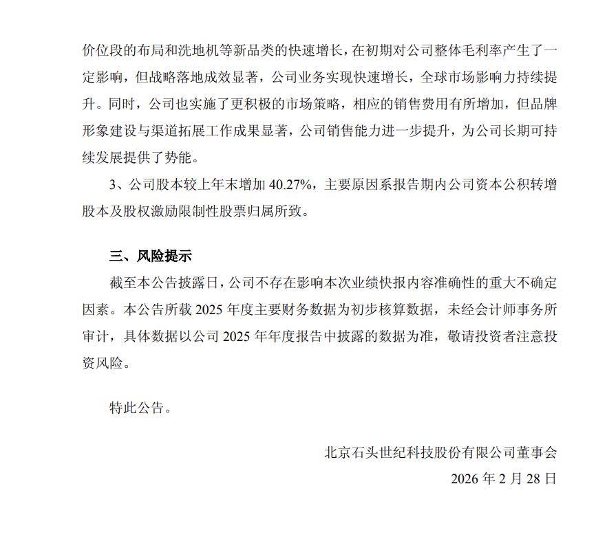 石頭科技最新發布的業績快報顯示,2025年公司經營呈現營收增長與利潤承壓并行的態勢。全年實現營業總收入186.16億元,同比增幅達55.85%,但歸屬于母公司股東的凈利潤為13.6億元,較上年同期下降31.19%,基本每股收益5.28元。這一數據反映出企業在規模擴張過程中面臨的階段性挑戰。