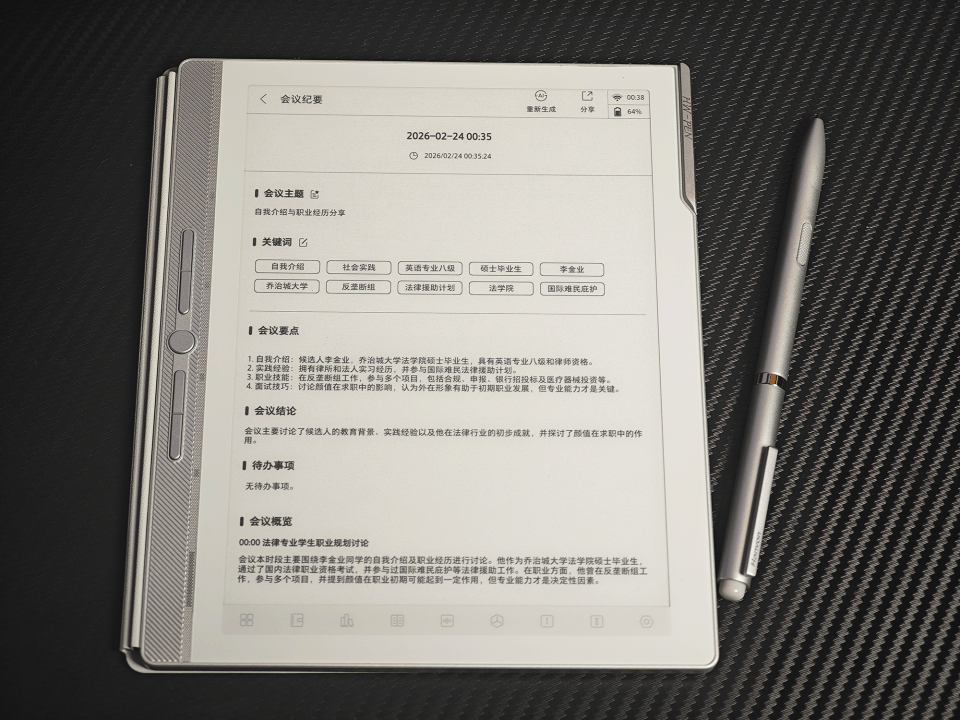在核心辦公場景中,三款產(chǎn)品均展現(xiàn)強大實力。語音轉(zhuǎn)寫功能支持四麥克風(fēng)陣列收音,可精準(zhǔn)區(qū)分講話者角色并生成會議紀(jì)要。漢王機型憑借DeepSeek與通義千問雙模型,在AI生成內(nèi)容速度與簡潔度上優(yōu)于科大訊飛;后者則通過豐富場景分類提升使用效率。書寫體驗方面,漢王8192級壓感筆實現(xiàn)筆觸隨力度變化,減屏層設(shè)計消除隔層干擾;科大訊飛4096級壓感筆雖書寫流暢,但精細繪圖場景略顯不足。