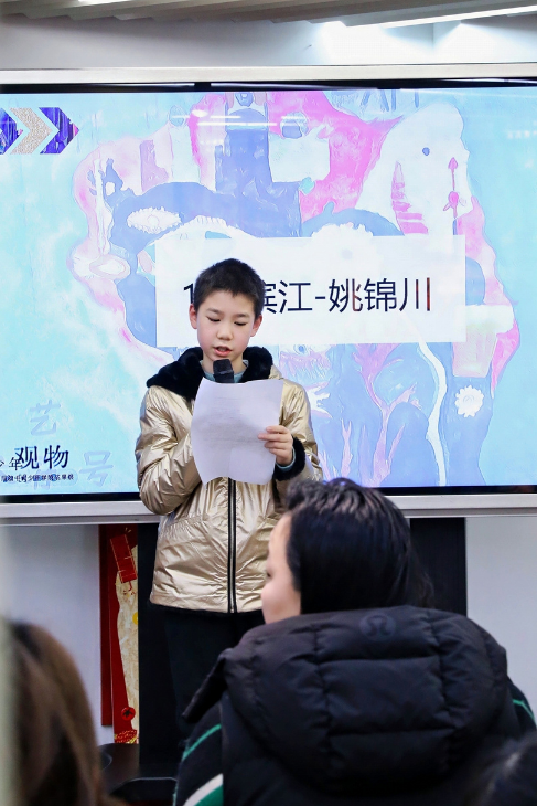 少年觀物,不只是作品的展示,更是孩子們表達(dá)自我的舞臺。開幕式上的致辭、站在作品前向來往觀眾介紹創(chuàng)作思路、和小伙伴分享自己與藝術(shù)的故事……每一種表達(dá),都被認(rèn)真傾聽。