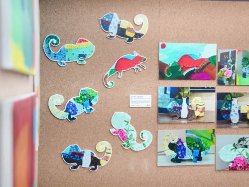 觀色尋序展區(qū),是藝術(shù)探索的第一站。觀色,就是學(xué)會觀察色彩的樣子,感受色彩的情緒,發(fā)現(xiàn)顏色和世界之間的聯(lián)系。從隨心涂色,到慢慢學(xué)會搭配色彩、用色彩表達(dá)心情——每一幅作品,都是孩子們在蕃茄田藝術(shù)課程中對色彩的觀察和理解。其中《波點(diǎn)變形計》系列作品,靈感來自變色龍會根據(jù)環(huán)境變顏色的特性,孩子們分析環(huán)境色彩,調(diào)配相應(yīng)顏色,用大大小小、深深淺淺的波點(diǎn),一層層地藏在變色龍身上,完成了一場“隱藏變色龍”的色彩游戲。