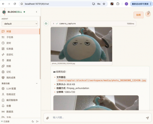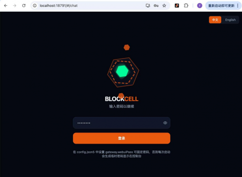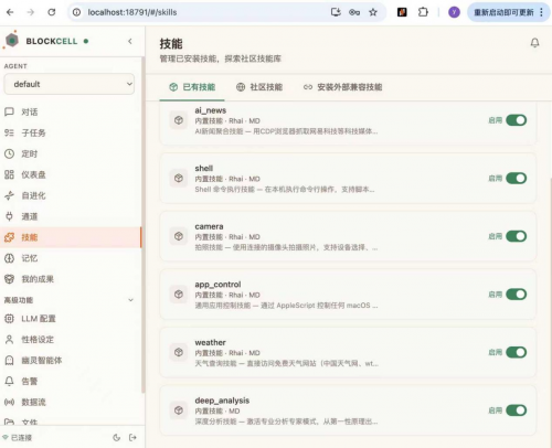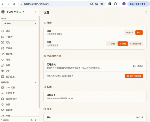到這里,你就可以看到 Blockcell 的 WebUI,后續(xù)也可以在這里繼續(xù)測試對話、查看任務(wù)狀態(tài)和管理運行中的智能體。