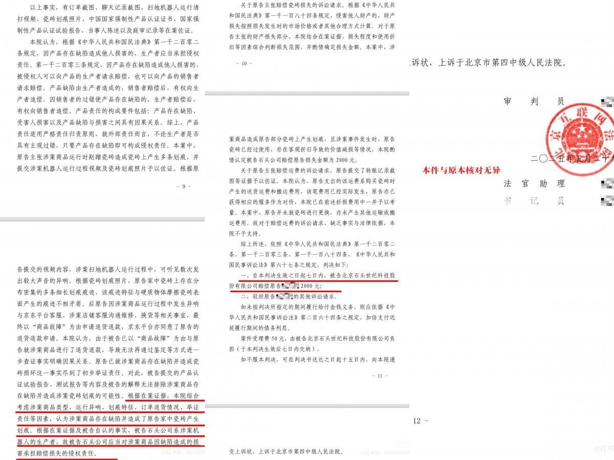 北京互聯網法院審理認為,根據《民法典》產品責任條款,生產者需就缺陷產品與損害結果無因果關系承擔舉證責任。石頭科技雖提供國家強制性產品認證報告,但未能解釋為何接觸部件標注為"軟性材質"的產品,仍會造成規則劃痕。反觀戴先生提交的47分鐘跟拍視頻、劃痕位置時間軸、金屬部件檢測報告等證據鏈,形成完整證明體系。法院最終認定產品存在設計缺陷,判決賠償修復費用2000元。