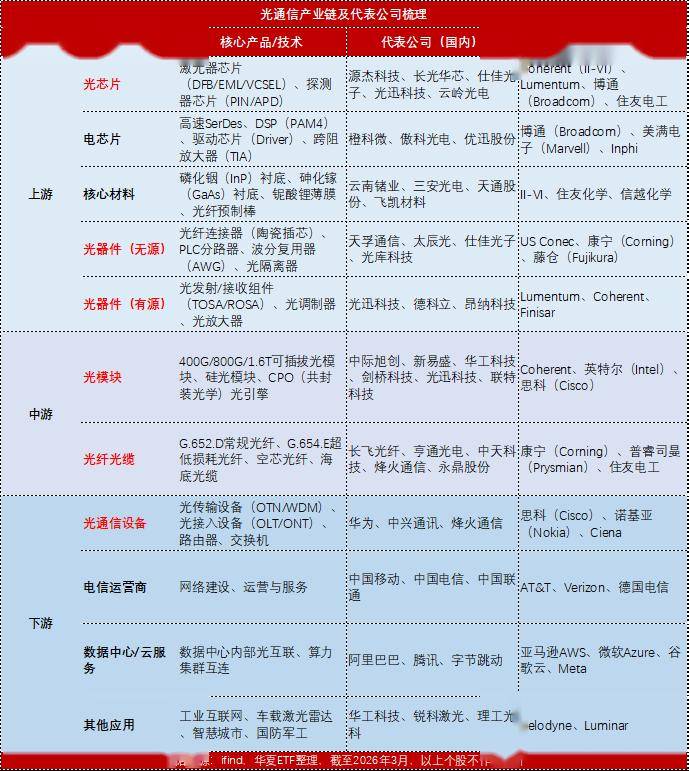 AI算力需求爆發(fā)背景下,光通信成為關(guān)鍵基礎(chǔ)設(shè)施。傳統(tǒng)電信號傳輸在帶寬、損耗和功耗方面已達極限,而光信號憑借其高速特性成為破局關(guān)鍵。光通信以激光為載體、光纖為通道,構(gòu)建起覆蓋全球的AI運算網(wǎng)絡(luò)。光模塊、光芯片、光器件等細(xì)分領(lǐng)域均圍繞這一核心展開。