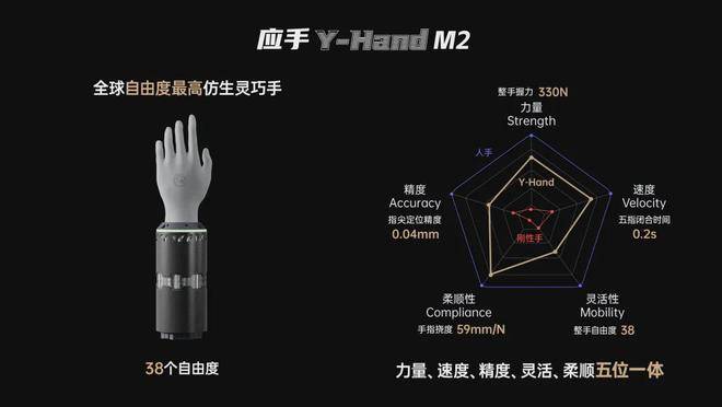 應(yīng)手Y?HandM2的研發(fā)基于任雷教授首創(chuàng)的仿生拉壓體理論,實(shí)現(xiàn)了三大核心創(chuàng)新:通過模擬生物關(guān)節(jié)的6自由度運(yùn)動(dòng)機(jī)制,替代傳統(tǒng)剛性鉸鏈設(shè)計(jì);集成磁集電驅(qū)人工肌肉技術(shù),將驅(qū)動(dòng)、變速與傳動(dòng)功能融為一體;采用剛?cè)狁詈舷到y(tǒng)架構(gòu),在確保動(dòng)力傳輸效率的同時(shí)提升安全交互性能。這些創(chuàng)新使產(chǎn)品在力量、速度、精度等關(guān)鍵指標(biāo)上達(dá)到行業(yè)領(lǐng)先水平——整手握力達(dá)330N,五指閉合僅需0.2秒,指尖定位精度突破0.04mm,自由度數(shù)量保持38個(gè)的全球紀(jì)錄。