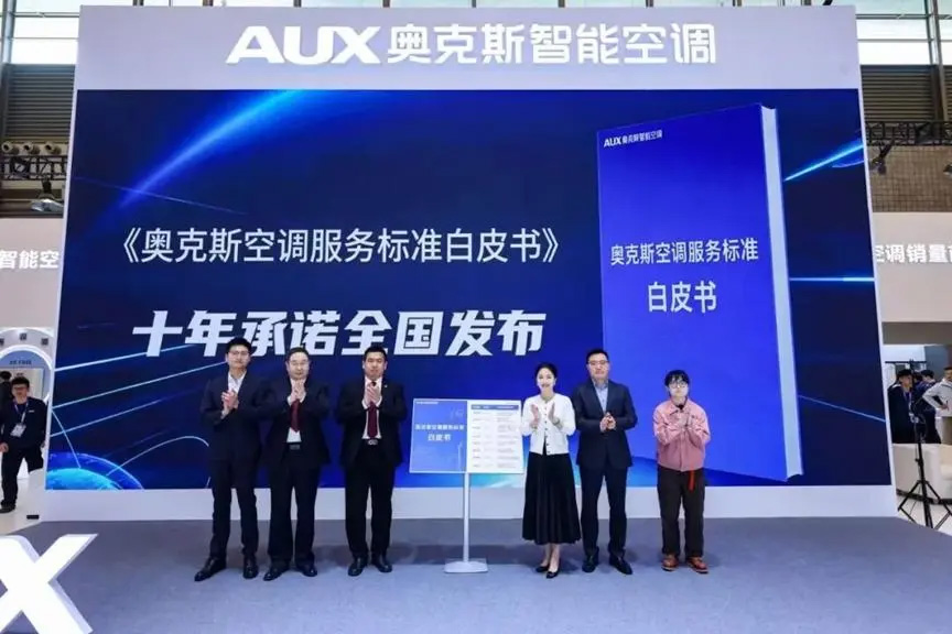 AWE現場,奧克斯在中國家電服務維修協會、國家市場監督管理總局等機構的見證下,鄭重承諾自2026年1月1日起,全系分體空調實行“整機十年包修”服務,并發布《奧克斯空調服務標準白皮書》。