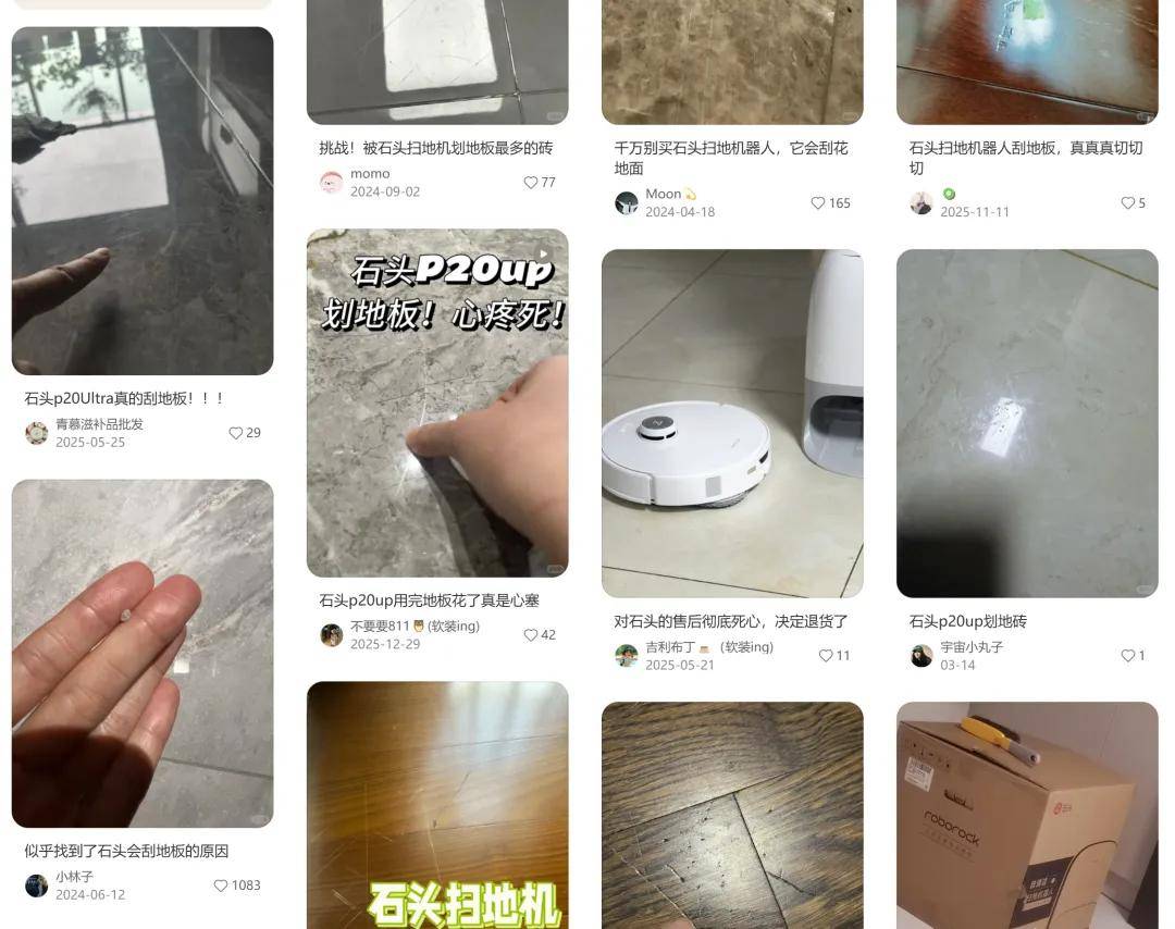 戴先生的遭遇并非個(gè)案。在小紅書等平臺(tái)搜索“石頭掃地機(jī) 劃傷”,大量用戶分享了類似經(jīng)歷。從P10系列到P20系列,多款主力機(jī)型均被投訴導(dǎo)致瓷磚、木地板出現(xiàn)不可修復(fù)的劃痕。有用戶表示:“新房剛?cè)胱?,掃地后出現(xiàn)一米多長的劃痕,簡(jiǎn)直崩潰?!绷碛杏脩敉ㄟ^慢鏡頭回放發(fā)現(xiàn),劃痕多產(chǎn)生于機(jī)器旋轉(zhuǎn)拖地時(shí),且一旦出現(xiàn)便無法通過清潔或打磨消除。
