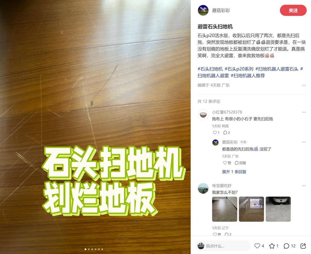 這場個案背后,是社交平臺上鋪天蓋地的同類投訴。在小紅書等平臺搜索“石頭掃地機 劃傷”,大量用戶曬出瓷磚、木地板被刮出刀割般痕跡的照片。從P10系列到P20系列,多款主力機型均涉及此類問題,用戶描述中“避雷”“天塌了”“刮地收割器”等詞匯頻繁出現(xiàn)。更值得注意的是,這些劃痕多發(fā)生在機器旋轉(zhuǎn)拖地時,且一旦出現(xiàn)便無法修復,暴露出可能存在的系統(tǒng)性設計缺陷。