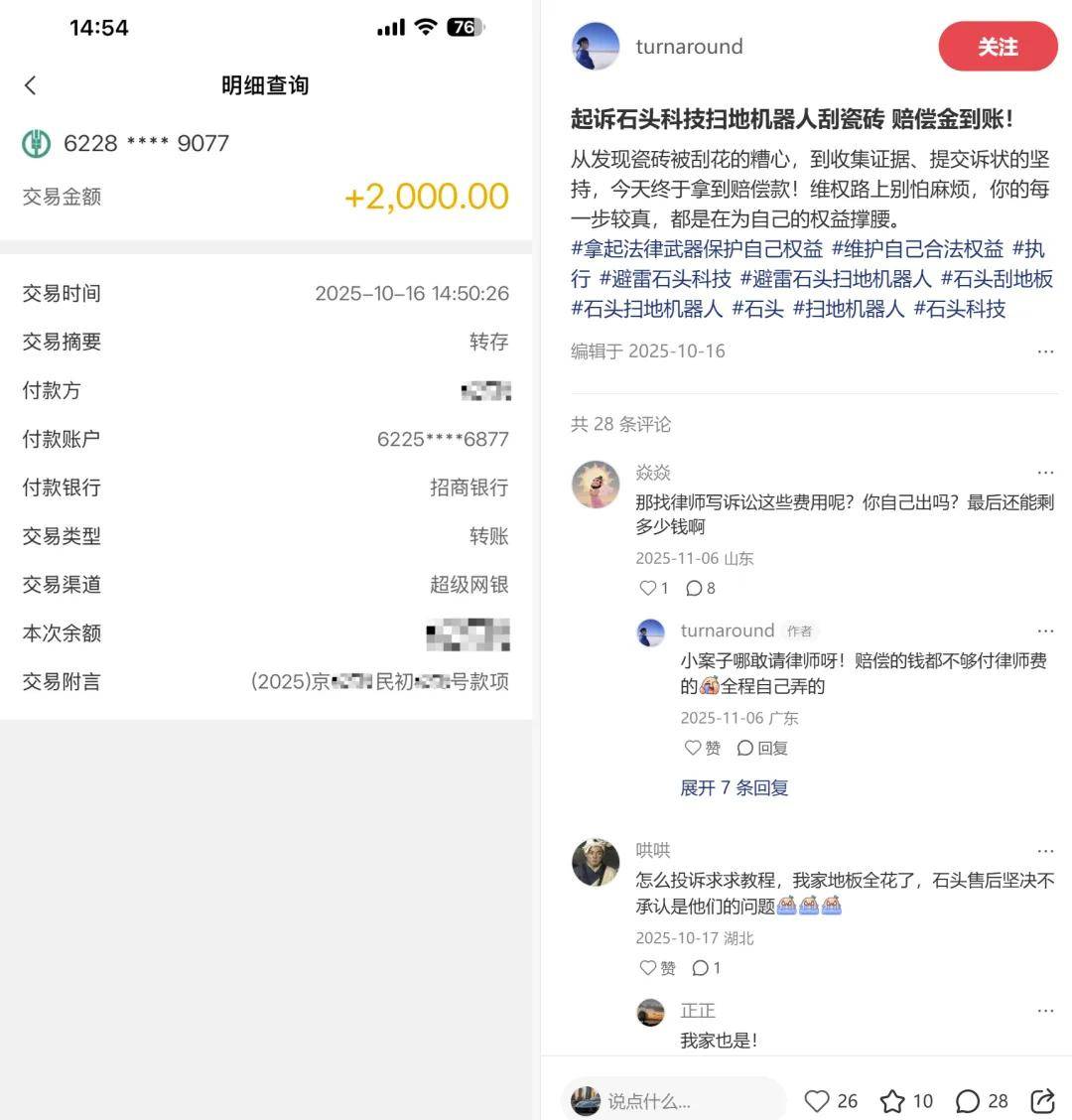 戴先生的維權之路充滿波折。面對用戶質(zhì)疑,石頭科技客服始終以“產(chǎn)品經(jīng)過嚴格測試”為由拒絕擔責,甚至以“測試報告屬商業(yè)機密”為由拒絕提供相關證明。在無人上門檢測、訴求被擱置的情況下,戴先生通過連續(xù)47分鐘跟拍機器工作、記錄剮蹭聲并比對劃痕的方式,完成了關鍵證據(jù)鏈的構(gòu)建。法院二審認定,石頭科技未能證明產(chǎn)品無缺陷,而戴先生提供的視頻證據(jù)充分證明了旋轉(zhuǎn)拖地功能與劃痕之間的因果關系。