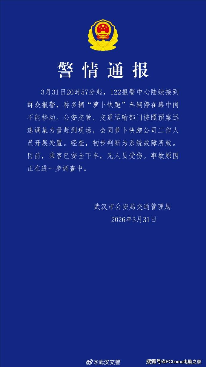 武漢市公安局交通管理局發(fā)布通報,確認3月31日晚間多輛“蘿卜快跑”自動駕駛車輛在武漢市區(qū)道路出現(xiàn)集體停滯故障。據(jù)初步調(diào)查,事故由系統(tǒng)異常引發(fā),未造成人員傷亡,具體原因仍在深入核查中。