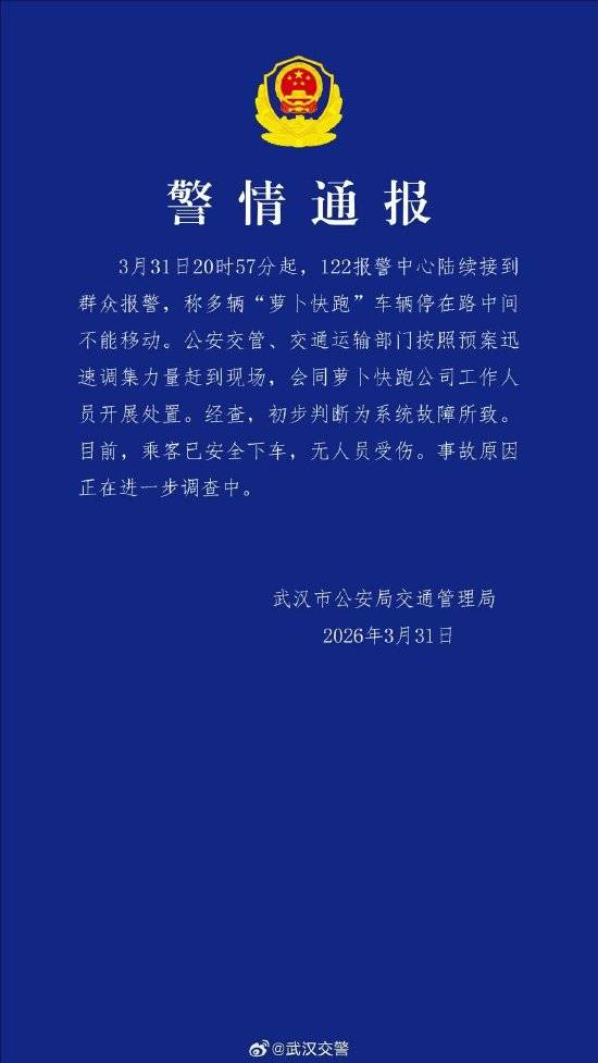 武漢市公安局交通管理局近日發(fā)布通報稱,3月31日晚間,武漢多個路段出現(xiàn)多輛“蘿卜快跑”自動駕駛車輛集體停滯現(xiàn)象。涉事車輛均停在道路中央無法繼續(xù)行駛,現(xiàn)場未造成人員傷亡,所有乘客已在相關(guān)部門協(xié)助下安全轉(zhuǎn)移。交管部門聯(lián)合交通運輸局及運營企業(yè)第一時間啟動應(yīng)急預(yù)案,目前具體技術(shù)故障原因仍在深入排查中。