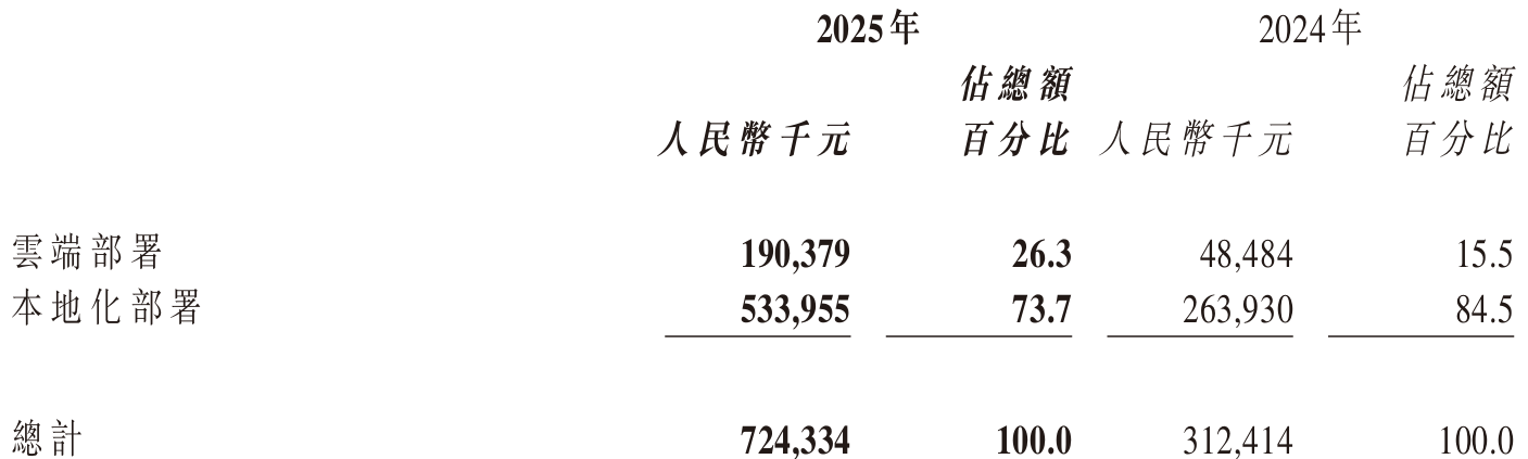 從業務結構來看,智譜的云端部署與本地化部署呈現出不同的發展態勢。云端部署收入去年達到1.90億元,同比增長293%,主要得益于模型調用量的顯著增加;而本地化部署作為營收主力,去年貢獻了5.34億元,同比增長102%,但在整體營收中的占比有所下降,從2024年的近85%降至74%。這一變化反映出智譜業務結構的優化,但尚未迎來根本性轉折。