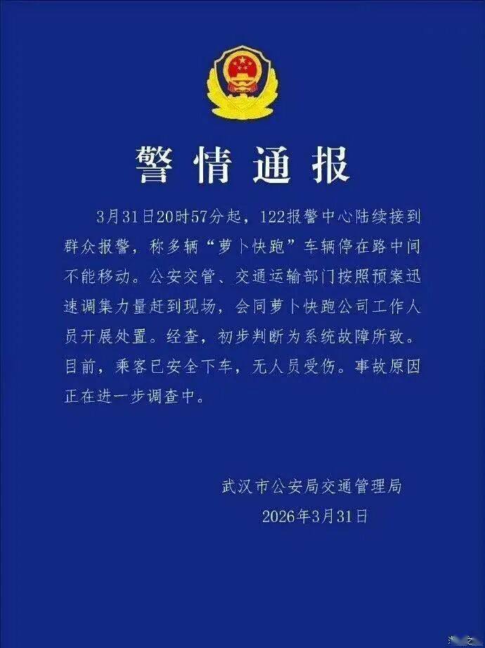 武漢市公安局交通管理局近日發(fā)布通報(bào)稱,3月31日晚間,122報(bào)警中心陸續(xù)接到市民反映,多輛“蘿卜快跑”自動(dòng)駕駛車(chē)輛在行駛過(guò)程中突然停駐,導(dǎo)致部分路段交通受阻。接報(bào)后,公安交管部門(mén)聯(lián)合交通運(yùn)輸局迅速啟動(dòng)應(yīng)急預(yù)案,調(diào)派警力與技術(shù)人員趕赴現(xiàn)場(chǎng),同時(shí)聯(lián)系運(yùn)營(yíng)企業(yè)協(xié)同處置。