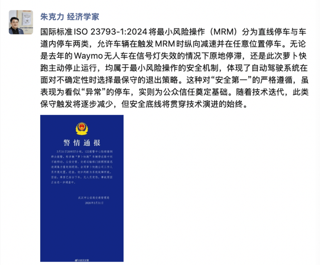 3月31日晚,武漢街頭一輛“蘿卜快跑”無(wú)人駕駛汽車突然平穩(wěn)停下,雙閃燈規(guī)律閃爍。這一場(chǎng)景被路人拍下后迅速在社交平臺(tái)引發(fā)熱議,有人戲稱“科幻片成真了”,也有人質(zhì)疑技術(shù)可靠性。無(wú)獨(dú)有偶,數(shù)月前美國(guó)舊金山街頭也出現(xiàn)過(guò)類似場(chǎng)景——Waymo無(wú)人車在無(wú)事故情況下主動(dòng)駐停。兩次事件背后,折射出公眾對(duì)自動(dòng)駕駛技術(shù)安全性的復(fù)雜認(rèn)知。