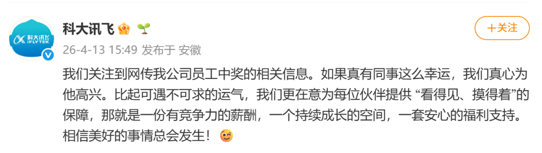 針對這一傳聞,科大訊飛官方賬號發布回應稱,公司已關注到相關網絡信息,并表示如果真有同事如此幸運,公司會真心為其感到高興。同時,科大訊飛強調,比起不可預測的運氣,公司更注重為每位員工提供切實的保障,包括有競爭力的薪酬、持續成長的空間以及安心的福利支持。