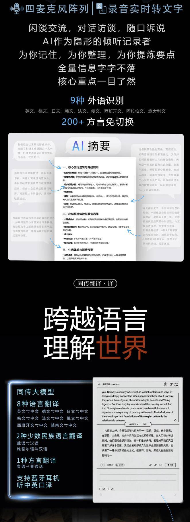 系統層面搭載定制版安卓14,深度整合科大訊飛AI技術棧。核心功能包括智能會議記錄(支持實時錄音轉文字)、多模態筆記融合(可同步手寫、語音與文字內容)以及智能摘要生成。這些功能特別針對商務辦公場景優化,用戶可通過語音指令快速調用不同功能模塊。