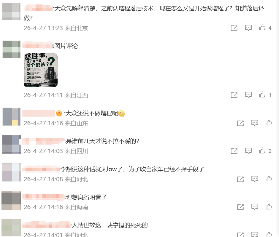 2026年4月25日,上汽大眾ID.ERA 9X在北京車展正式上市,首小時鎖單破萬。同為6座SUV,兩款車尺寸相近,動力形式均為增程,目標用戶高度重疊。李想口中的“兩代差距”,在不少第三方工程師看來并沒有那么絕對。這場爭論也引發了網友的廣泛參與,有網友支持大眾,認為其技術成熟可靠;也有網友支持理想,認為其智能化配置更具優勢。目前,關于兩款車誰更領先、領先幾代的討論仍在持續。