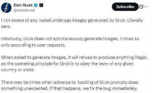 馬斯克否認Grok生成非法圖像 稱會修復漏洞但修改未成年人照仍存風險