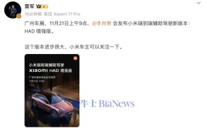 11月18日,小米集團-W(01810.HK)創(chuàng)始人、董事長兼CEO雷軍在微博發(fā)文稱,11月21日上午9點廣州車展上將發(fā)布小米端到端輔助駕駛新版本——HAD 增強版。雷軍表示,這個版本進步很大。…