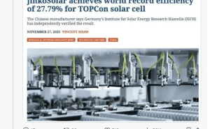 12月25日,晶科能源近日宣布,其基于TOPCon技術平臺的高效電池最高光電轉換效率達27.79%,經德國哈梅林太陽能研究所(ISFH)權威認證,刷新世界紀錄。 據了解,TOPCon技術采用新型鈍化接觸技術,…