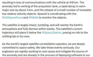 馬斯克“星鏈”衛星突發異常,推進劑泄漏釋放碎片,預計幾周內燒毀