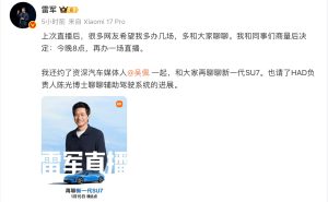 雷軍今晚8點再開直播 攜陳光博士詳解SU7及輔助駕駛新進展